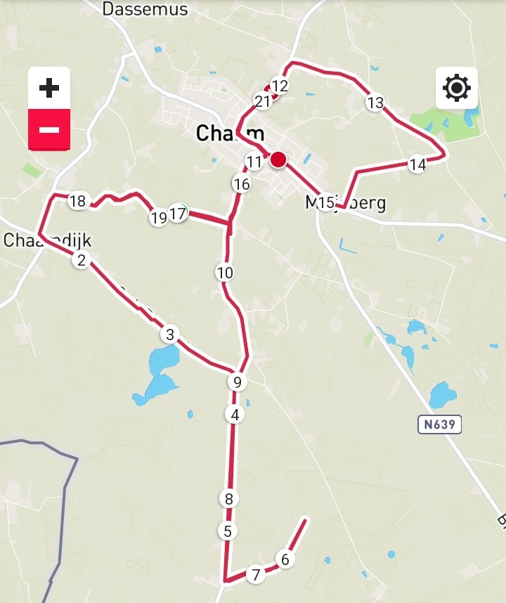 Route van Timo de Geus over 21.11 km tijdens de Halve Marathon.